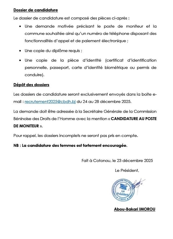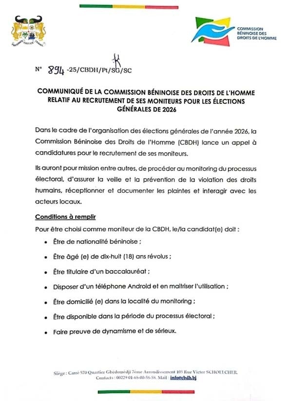 Le communiqué précise également les conditions à remplir pour être éligible au poste de moniteur de la CBDH. Les candidats doivent être de nationalité béninoise, âgés d’au moins 18 ans révolus et titulaires du baccalauréat. Ils doivent disposer d’un téléphone Android et en maîtriser l’utilisation, être domiciliés dans la localité où ils assureront le monitoring, et se rendre disponibles pendant toute la durée du processus électoral. La Commission insiste par ailleurs sur le dynamisme, le sérieux et le sens de la responsabilité des postulants.
